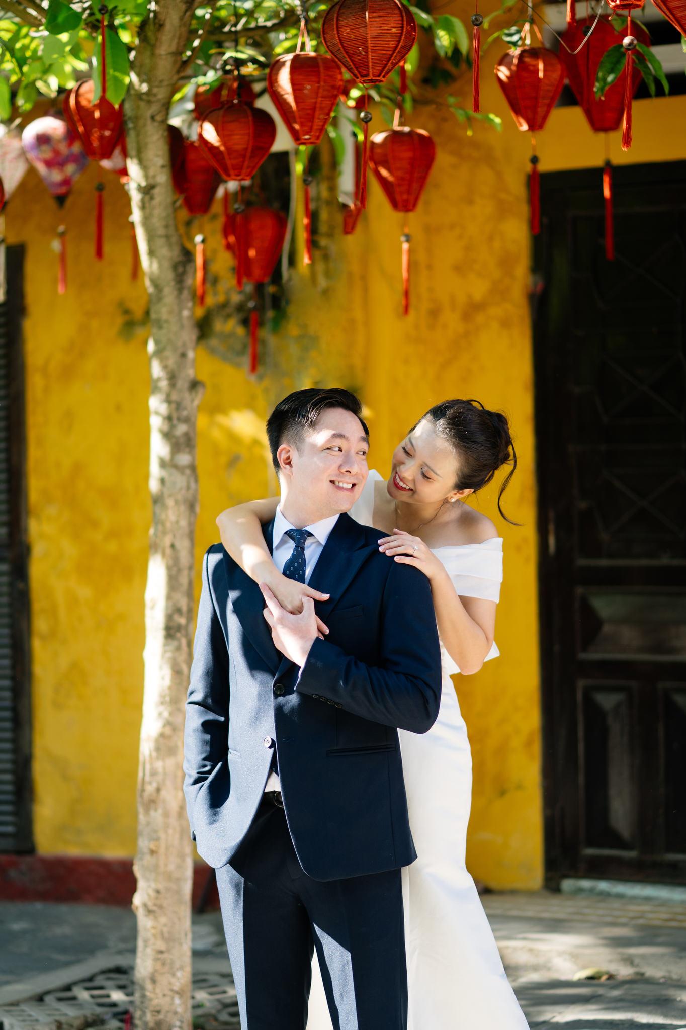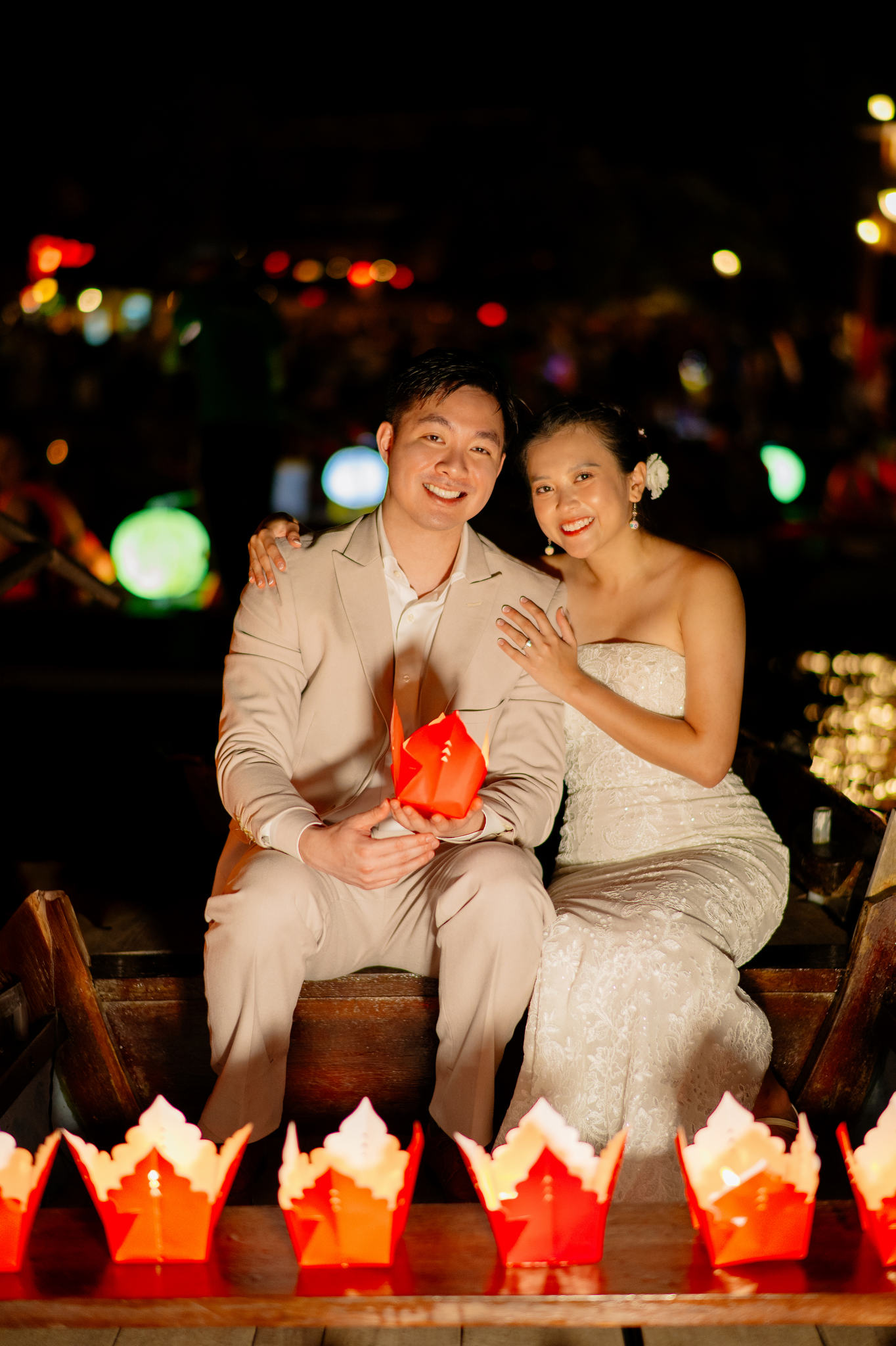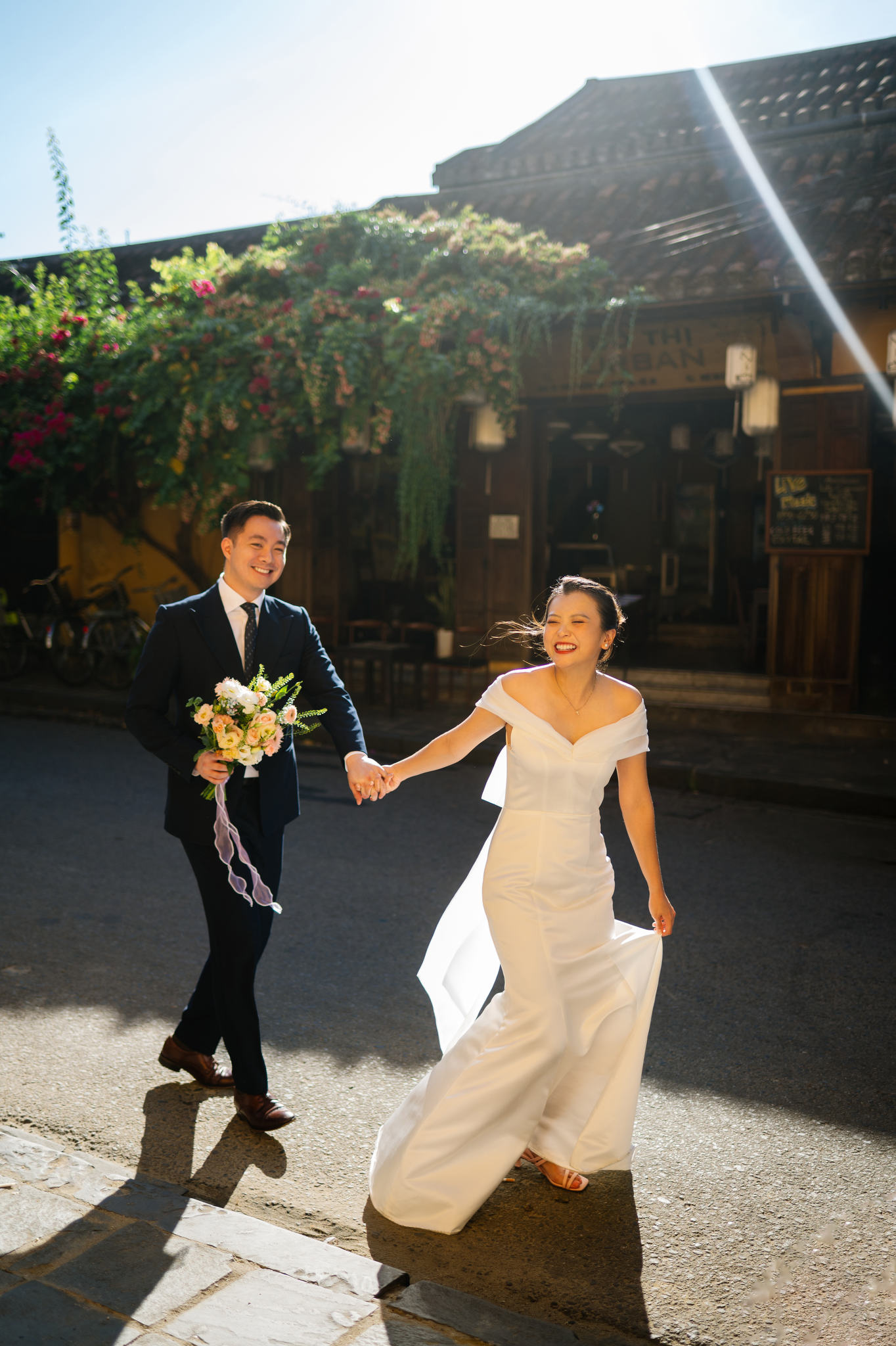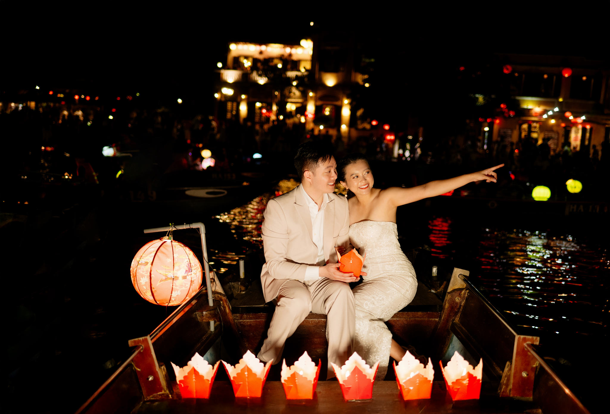 Hội An tràn đầy những góc nhỏ ẩn mình, từ những con phố cổ yên bình, bãi biển vàng rực rỡ, ánh đèn sôi động về đêm đến những cánh đồng cỏ đầy nắng. Cặp đôi từ Singapore đã trải nghiệm tất cả chỉ trong một ngày, mặc váy cưới và trang phục tự do, di chuyển linh hoạt giữa các địa điểm.