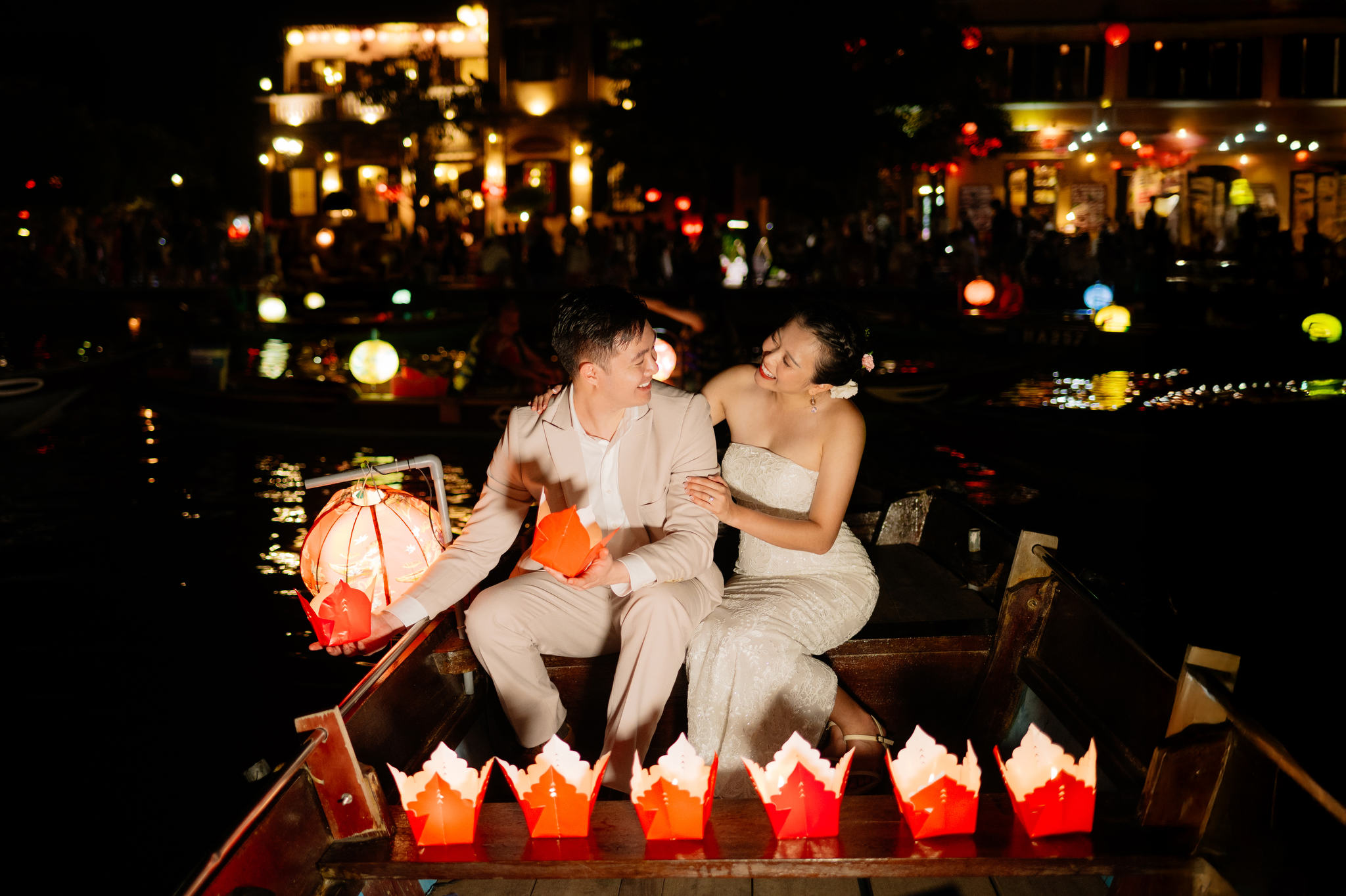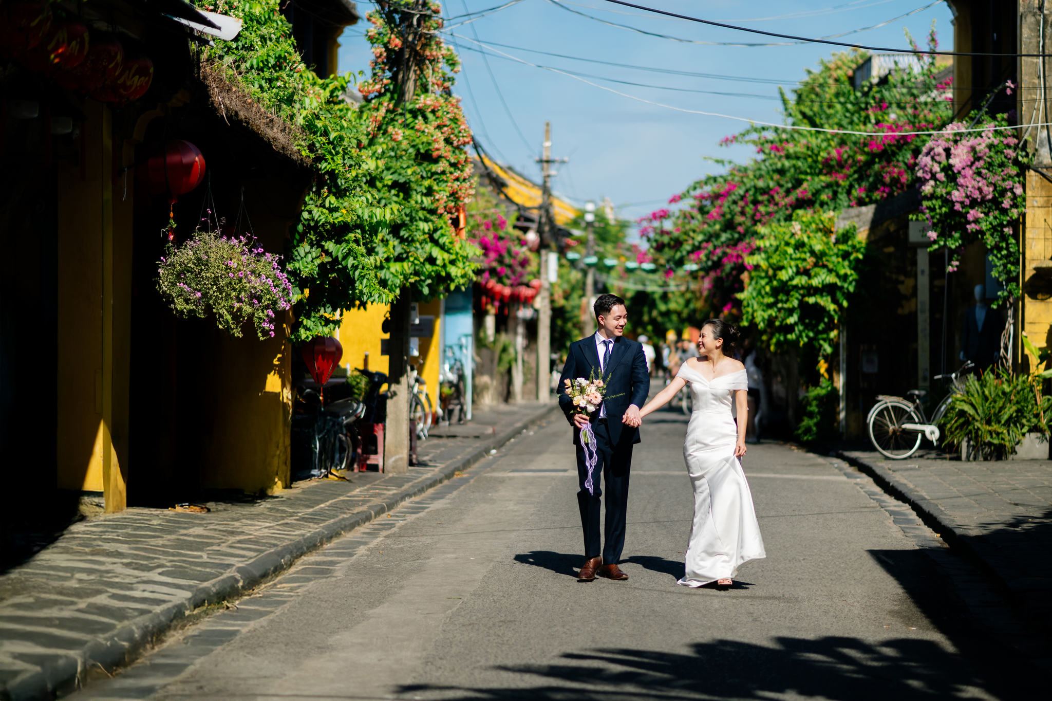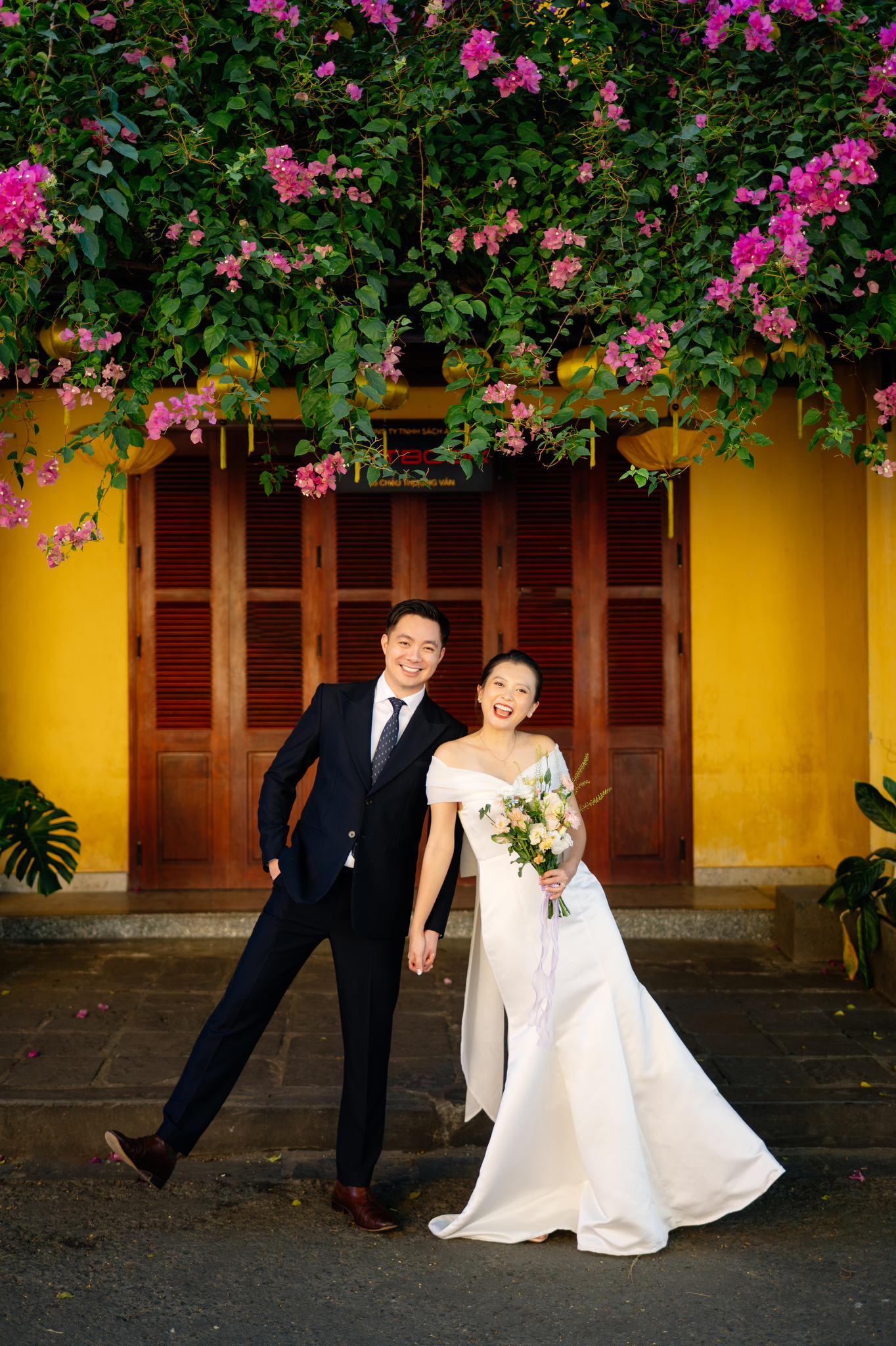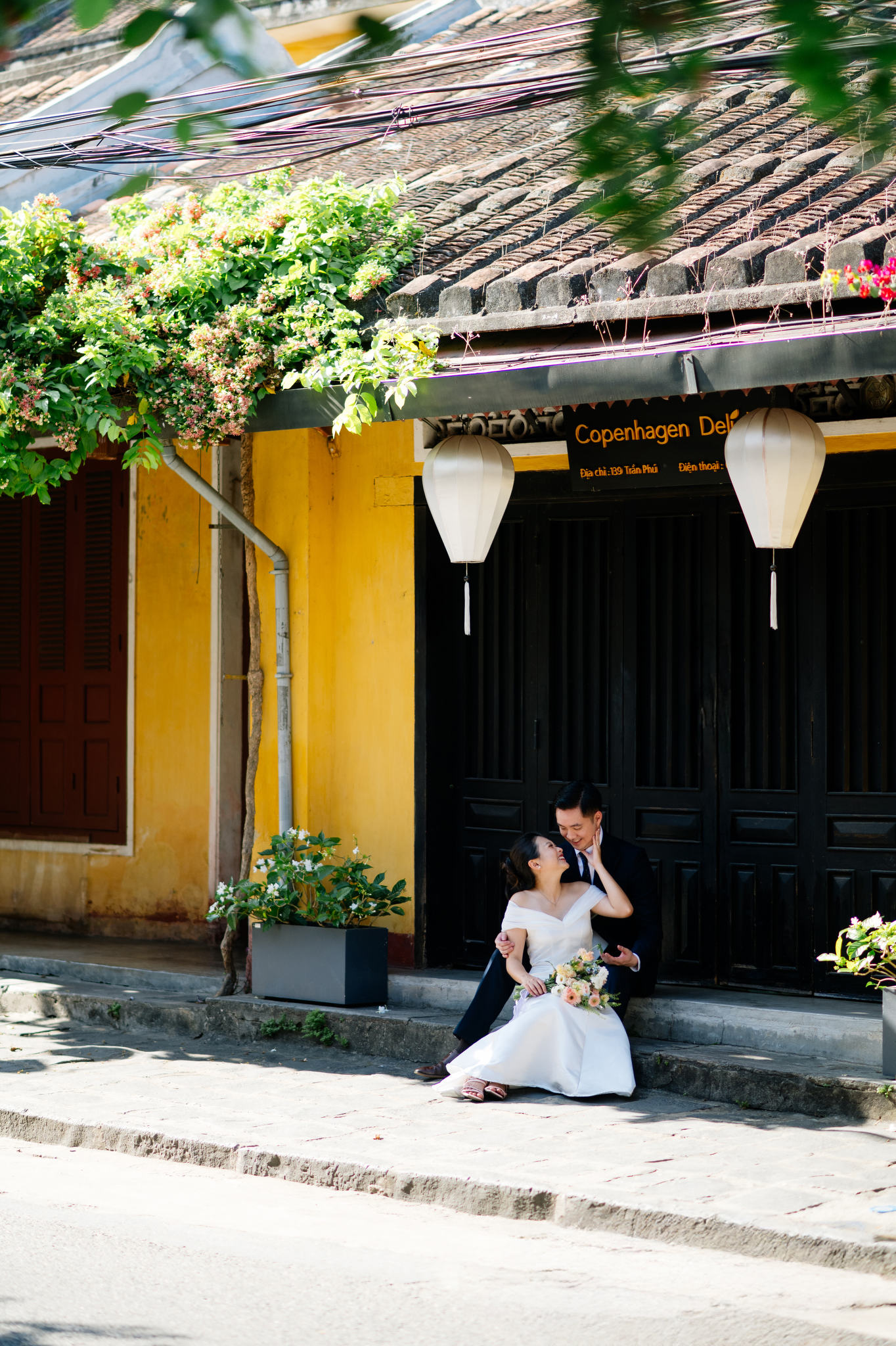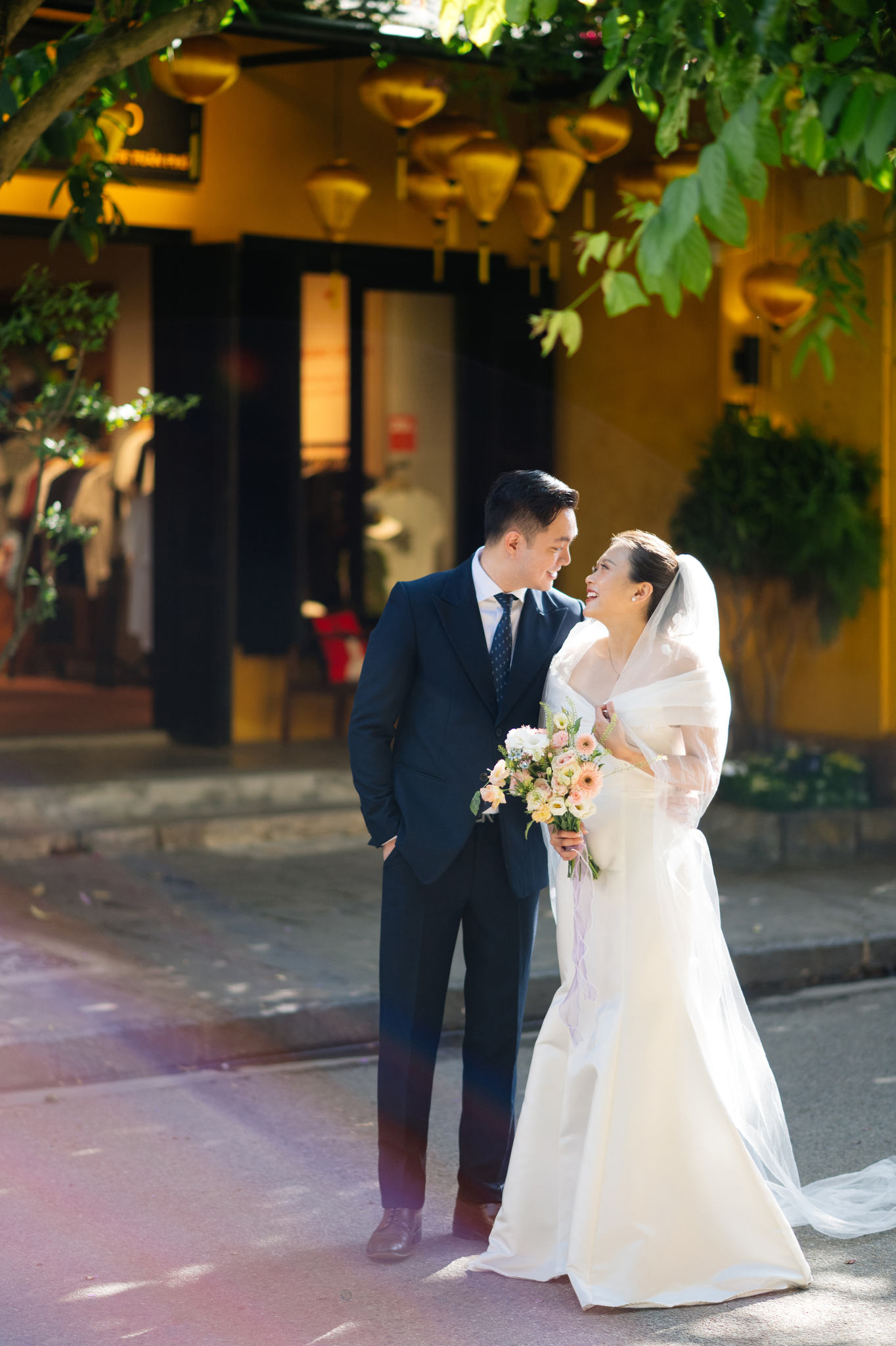 Hội An tràn đầy những góc nhỏ ẩn mình, từ những con phố cổ yên bình, bãi biển vàng rực rỡ, ánh đèn sôi động về đêm đến những cánh đồng cỏ đầy nắng. Cặp đôi từ Singapore đã trải nghiệm tất cả chỉ trong một ngày, mặc váy cưới và trang phục tự do, di chuyển linh hoạt giữa các địa điểm.