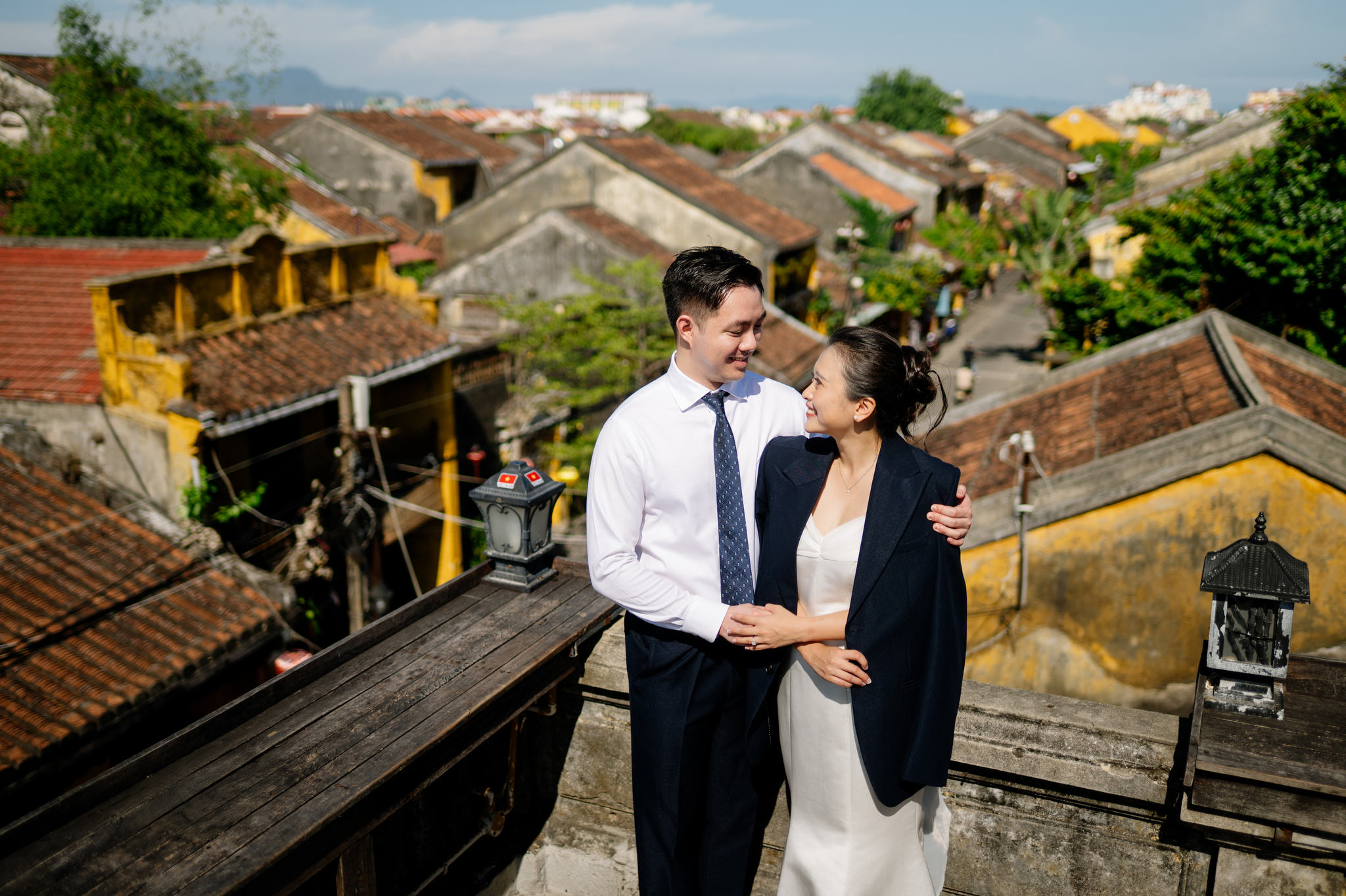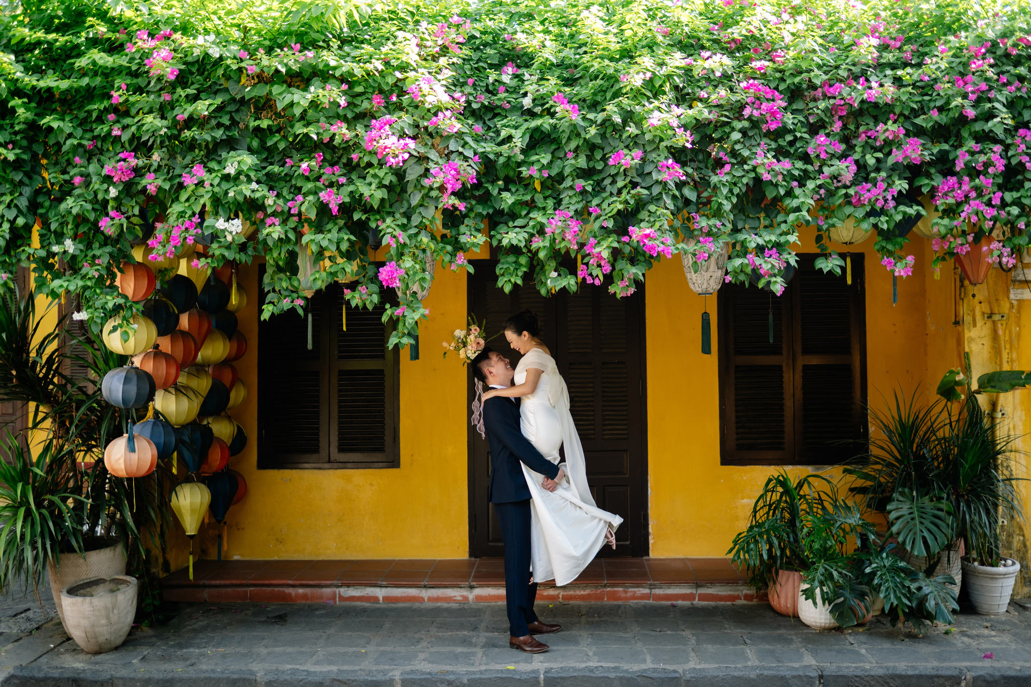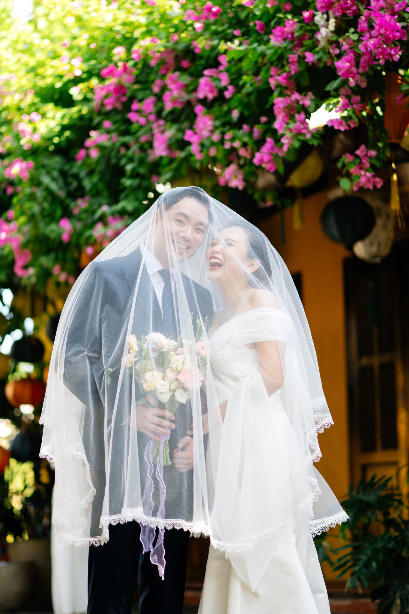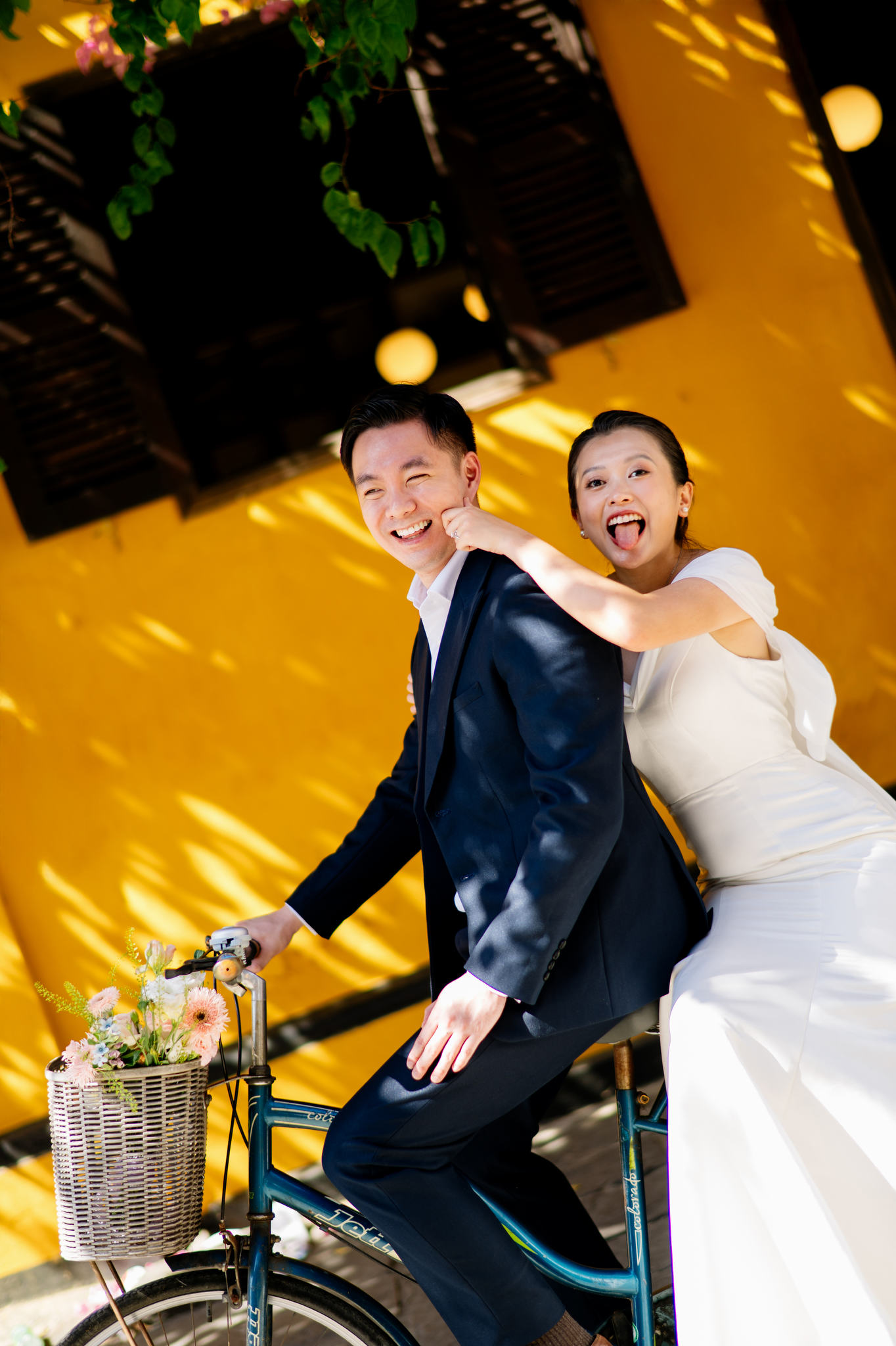 Hội An tràn đầy những góc nhỏ ẩn mình, từ những con phố cổ yên bình, bãi biển vàng rực rỡ, ánh đèn sôi động về đêm đến những cánh đồng cỏ đầy nắng. Cặp đôi từ Singapore đã trải nghiệm tất cả chỉ trong một ngày, mặc váy cưới và trang phục tự do, di chuyển linh hoạt giữa các địa điểm.