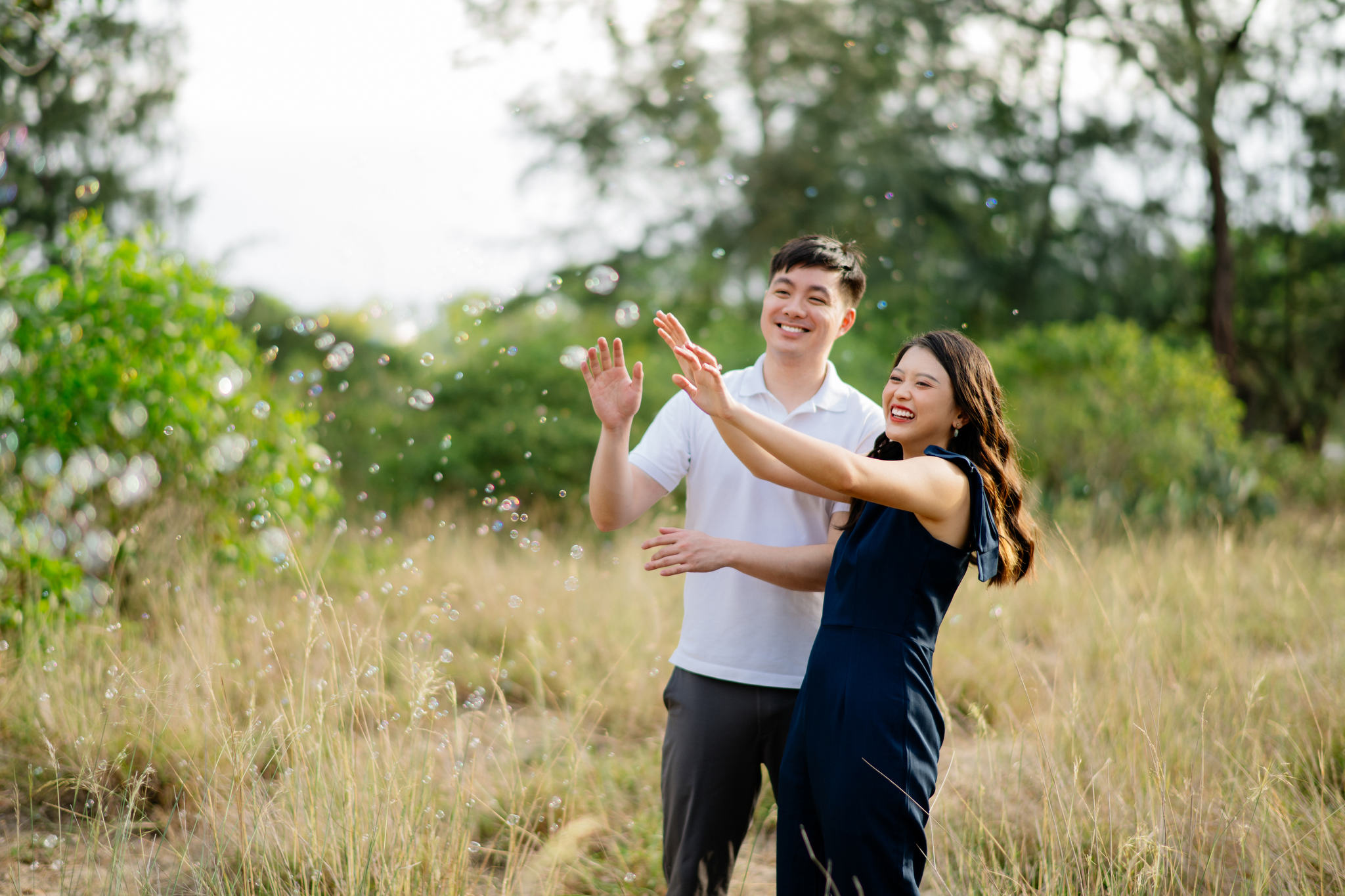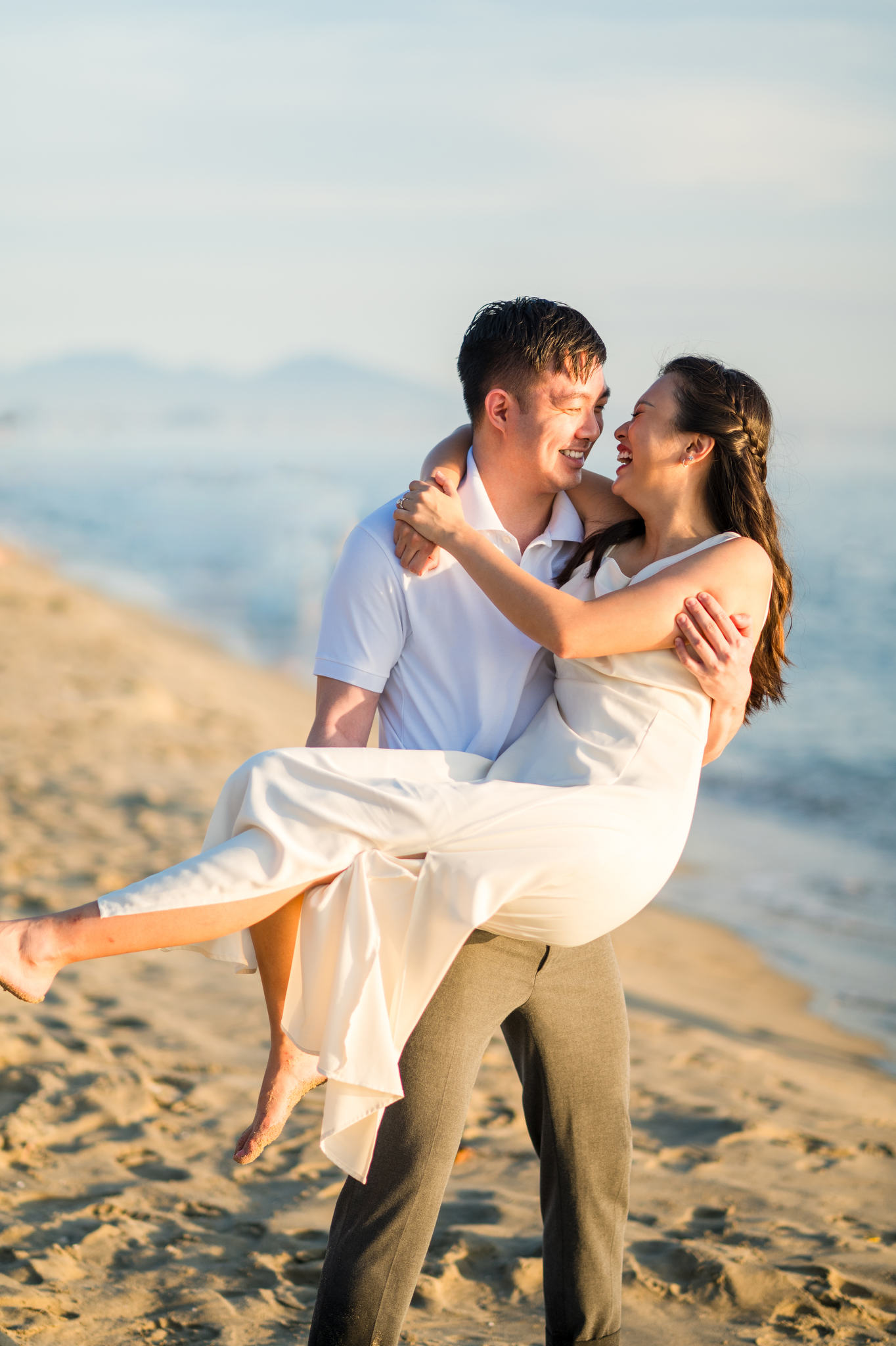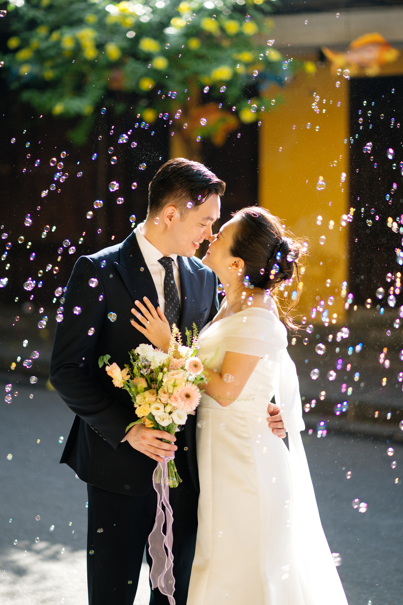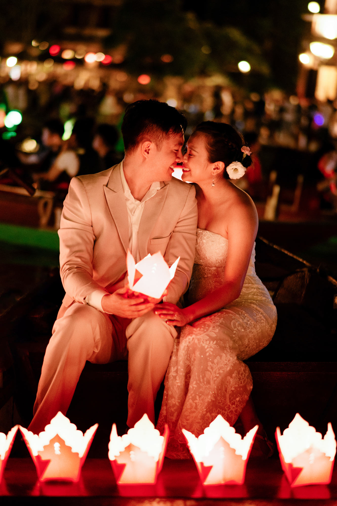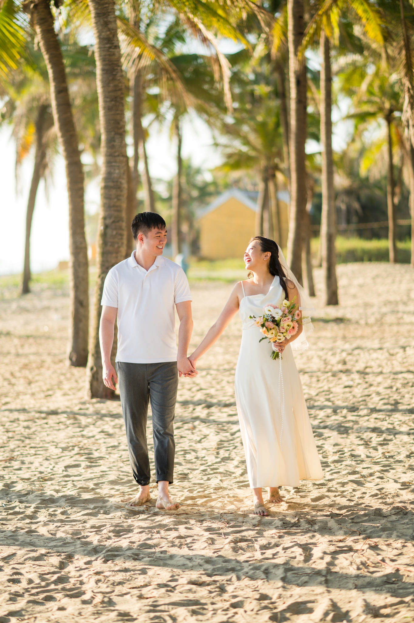 Hội An tràn đầy những góc nhỏ ẩn mình, từ những con phố cổ yên bình, bãi biển vàng rực rỡ, ánh đèn sôi động về đêm đến những cánh đồng cỏ đầy nắng. Cặp đôi từ Singapore đã trải nghiệm tất cả chỉ trong một ngày, mặc váy cưới và trang phục tự do, di chuyển linh hoạt giữa các địa điểm.